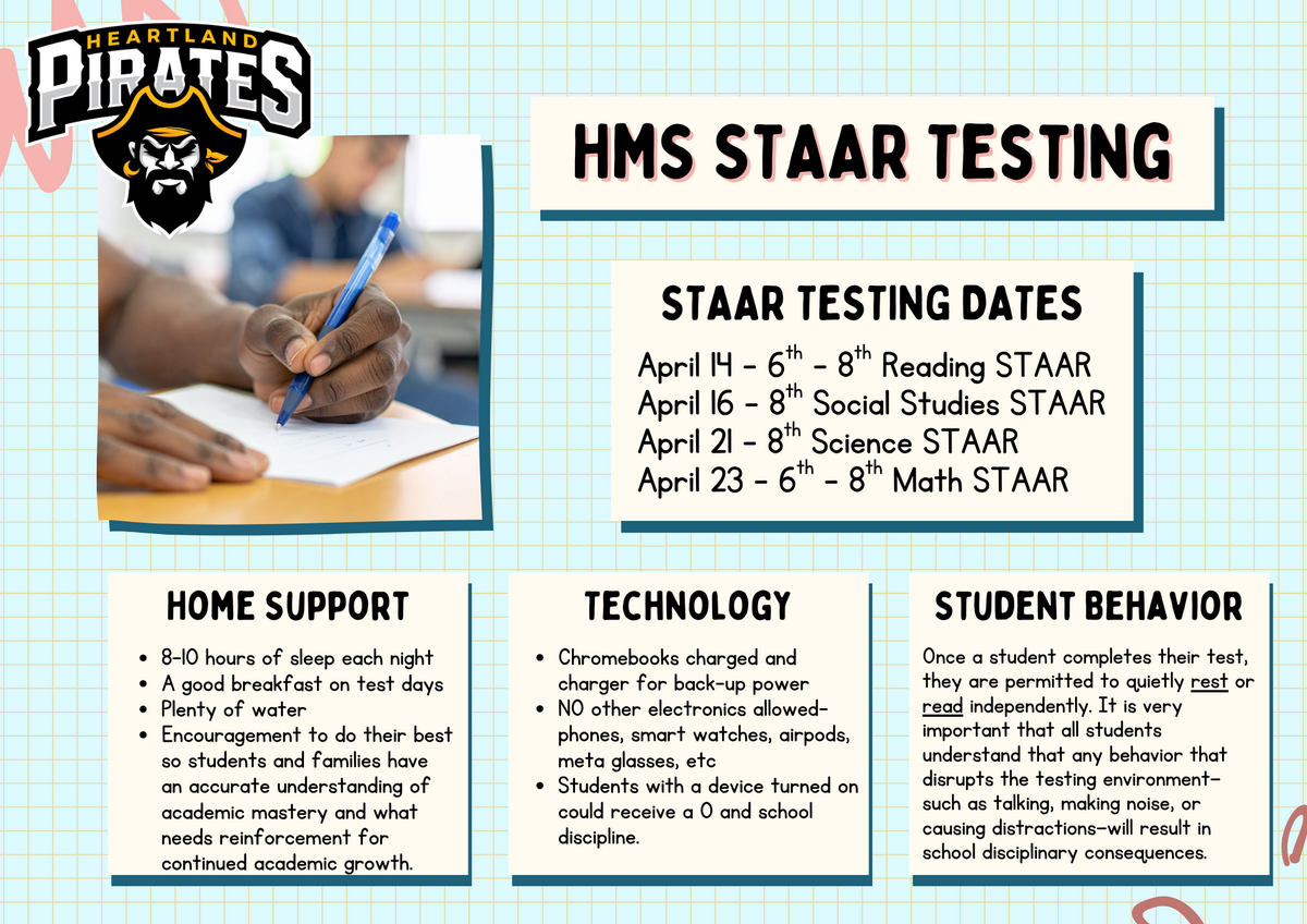 Good evening HMS Pirate families,This week, our HMS Pirates will begin STAAR testing, starting with the Reading STAAR for all 6th, 7th, and 8th grade students on Tuesday, April 14. We are incredibl...